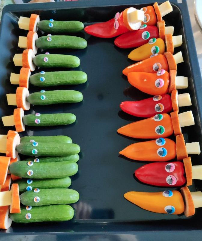 Voor deze traktatie heb je nodig: een mini paprika of komkommer, een plakje worst, een blokje kaas, een satéprikker en een paar wiebeloogjes. Rijg de ingrediënten op de prikker en plak de oogjes op de paprika of komkommer. Zo maak je in een handomdraai een vrolijk, gezond hapje dat kinderen aanspreekt!