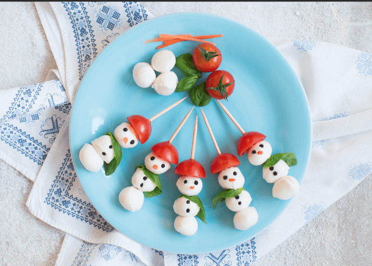 Onze vaste rubriek in de nieuwsbrief. Weer een leuk idee voor een gezonde traktatie. Sneeuwmannetjes van mozzarella, cherrytomaat en een blaadje basilicum. Rijg alles in de juiste volgorde op een satéprikker en je hebt een heerlijke winterse snack die er niet alleen leuk uitziet, maar ook lekker smaakt!