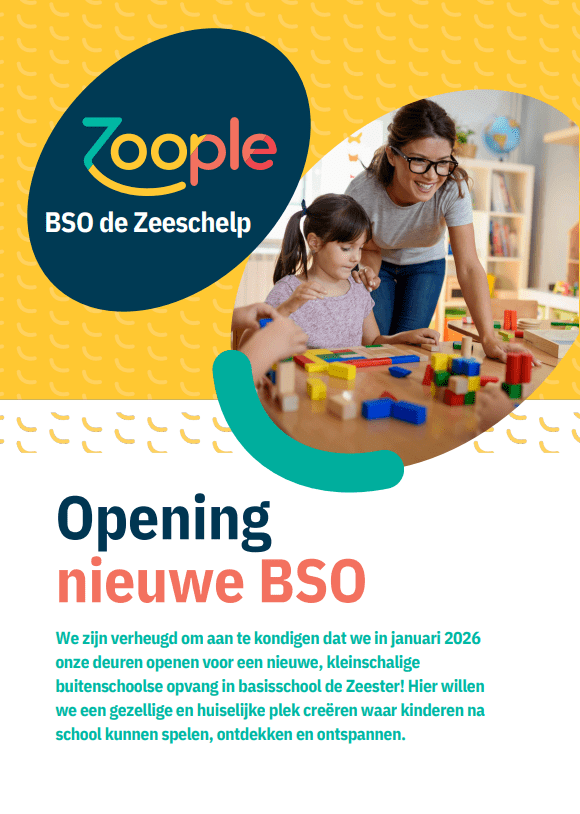 BSO de Zeeschelp biedt opvang binnen het gebouw van De Zeester voor kinderen van 4 tot 12 jaar. De behoeften van het kind én de ouders staan centraal. In een veilige, warme en stimulerende omgeving kunnen kinderen zichzelf zijn en zich op hun eigen tempo ontwikkelen.